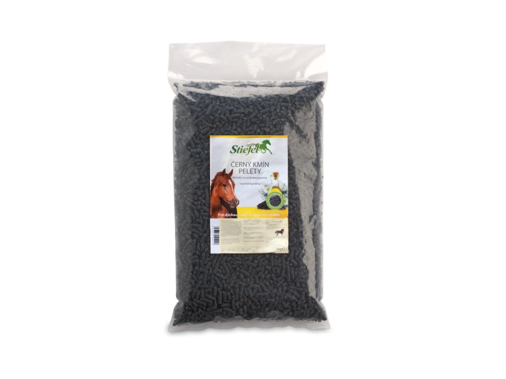 Olejová složka je u produktu Černý kmín pelety díky šetrnému lisování za studena mírně redukována asi o třetinu. Stiefel Černý kmín může podporovat obranyschopnost organismu, kůži a srst i dýchací cesty. Použijte i jako podpůrný krmný doplněk pro koně s ekzémem či letní vyrážkou. Peletky koně v krmné dávce dobře přijímají. V nabídce máme také 100% za studena lisovaný olej z černého kmínu.