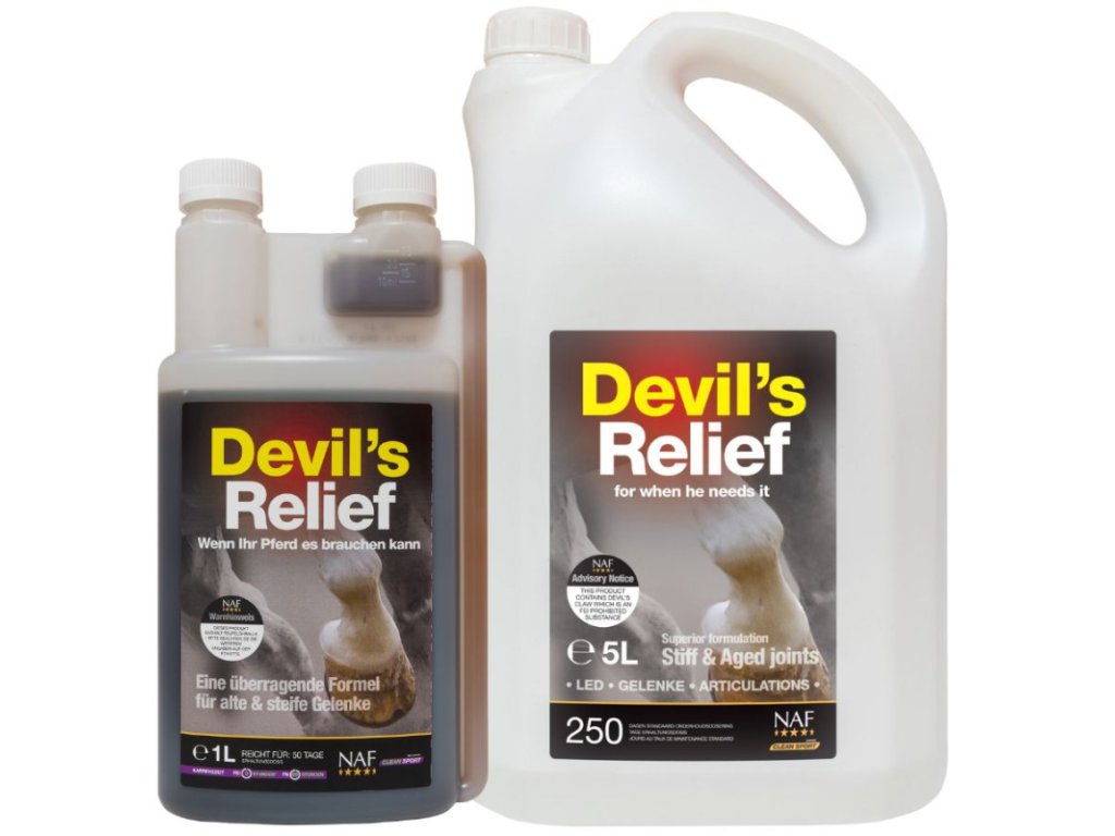 Devil’s Relief-čertův dráp tekutý je kombinací bylinných výtažků, tinktur a byliny čertův dráp – rostliny pocházející z Afriky. Devil’s Relief-čertův dráp tekutý poskytuje úlevu ztuhlým kloubům a při drobných poraněních, naražení,natažení, namožení nebo odřeninách. Přípravek  lze krmit všem koním a poníkům s výjímkou březích klisen.