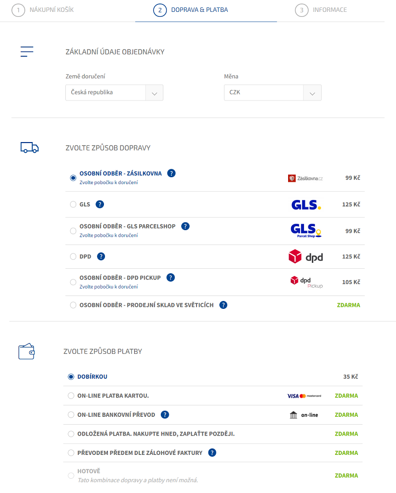 - Doprava a platba - Výběr typu platby a způsob dopravy