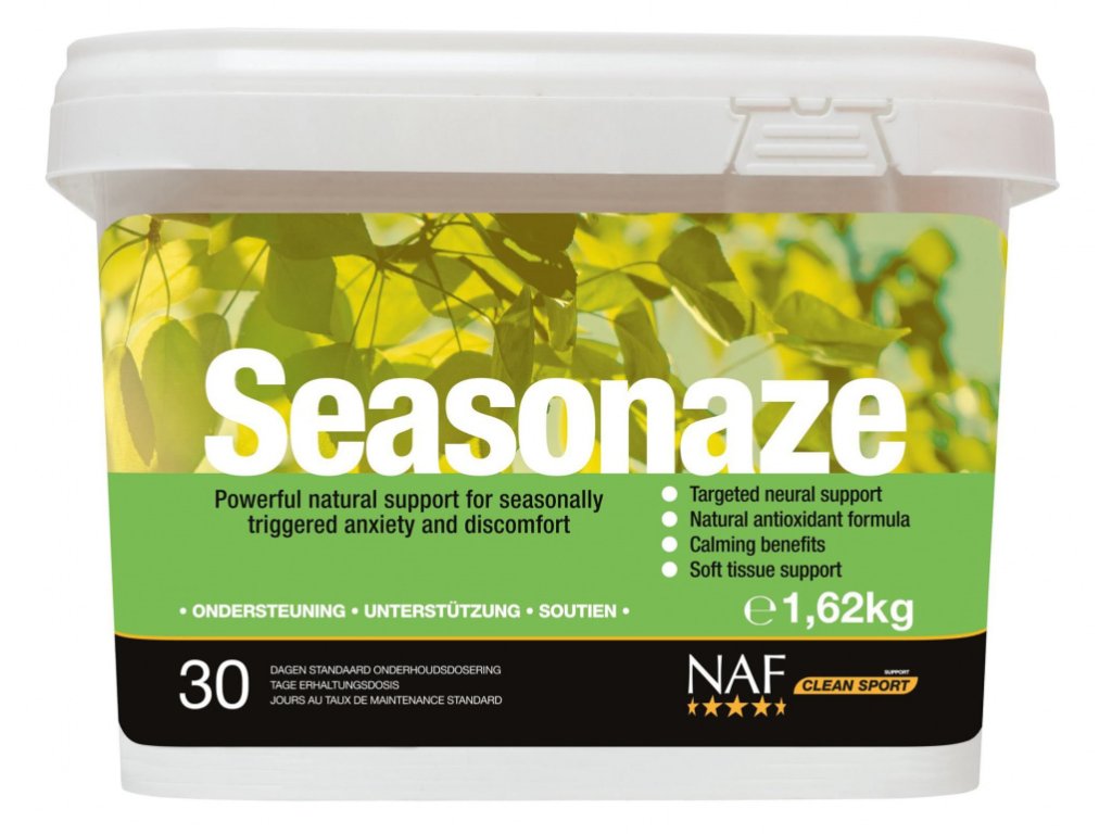 Někteří koně jsou za určitého počasí nebo jiných vnějších vlivů mnohem citlivější než obvykle. Díky komplexní kombinaci bylin, minerálů a vitamínů je Seasonaze ??jedinečným doplňkovým krmivem pro koně se sezónní nervozitou a problémy s chováním. Toto doplňkové krmivo od NAF podporuje imunitní systém organizmu a celkovou pohodu a vyrovnanost. Obsahuje přírodní komplex antioxidantů, jejichž účinnost byla vědecky prokázána. Volné radikály, které se nahromadily v těle, jsou odstraněny.
